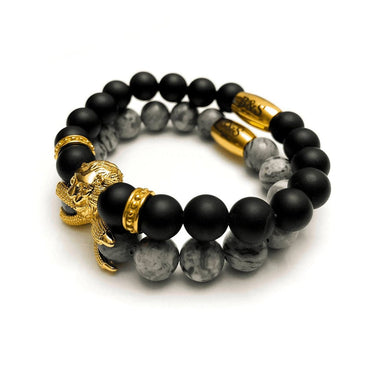 The Gold Lion & Grey Stones Bracelets Set is a stunning piece of jewelry that combines the symbol of the lion with the natural appeal of grey stones. This set features two man bracelets, each with a unique design that incorporates the symbol of the lion and grey stones. Plated with real gold, these beaded bracelets are perfect for adding a touch of regal elegance to any outfit.